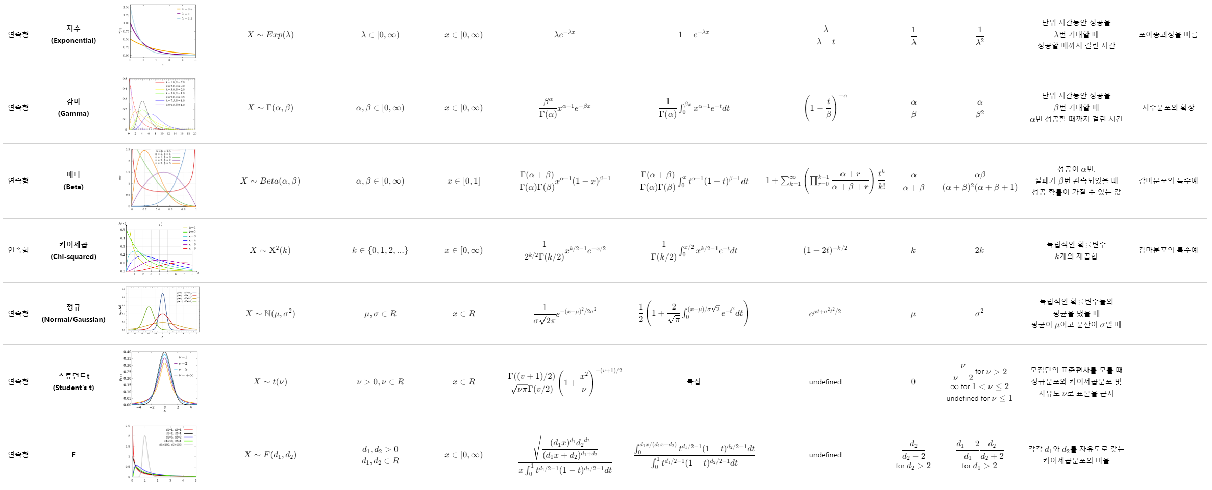 를 한 눈에 볼 수 있게 표로 정리해보았습니다. 편의를 위해 감마 함수는 풀어쓰지 못했으나, 다음과 같습니다.